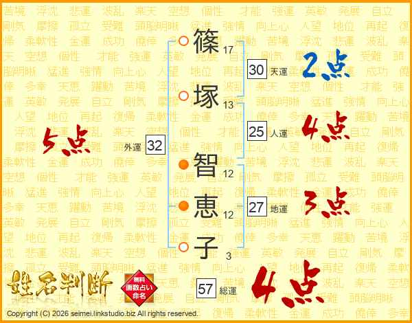 篠(17画)塚(13画) 智(12画)恵(12画)子(3画)