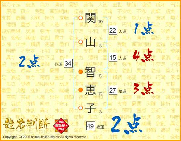 関(19画)山(3画) 智(12画)恵(12画)子(3画)