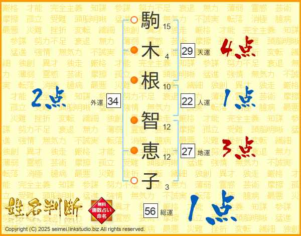 駒(15画)木(4画)根(10画) 智(12画)恵(12画)子(3画)
