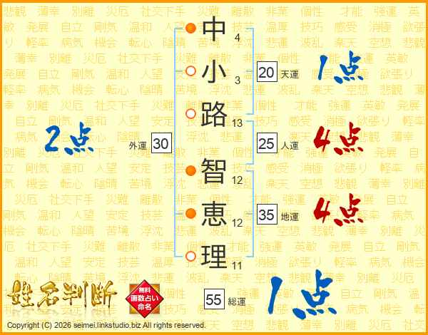 中(4画)小(3画)路(13画) 智(12画)恵(12画)理(11画)