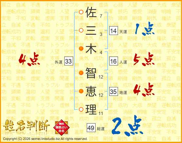 佐(7画)三(3画)木(4画) 智(12画)恵(12画)理(11画)