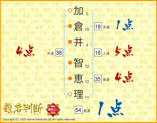 加(5画)倉(10画)井(4画) 智(12画)恵(12画)理(11画)