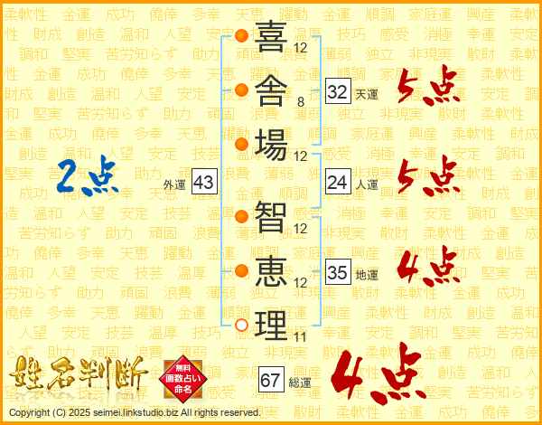喜(12画)舎(8画)場(12画) 智(12画)恵(12画)理(11画)