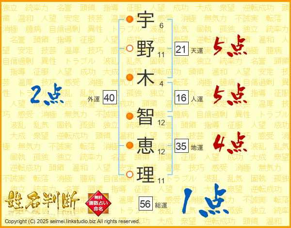 宇野木智恵理さんの天運は21画の5点!