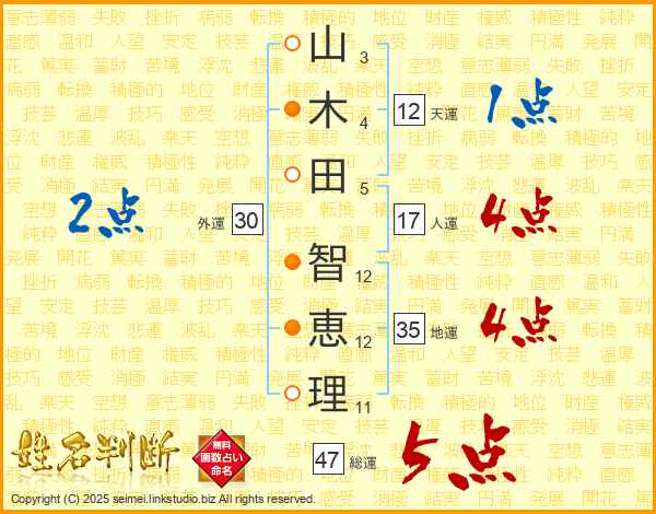 山(3画)木(4画)田(5画) 智(12画)恵(12画)理(11画)