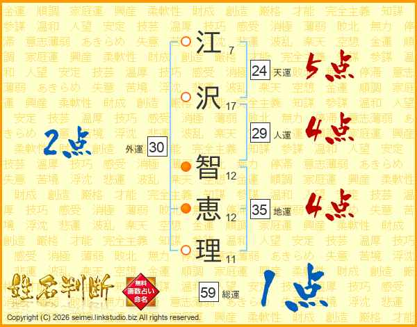 江(7画)沢(17画) 智(12画)恵(12画)理(11画)
