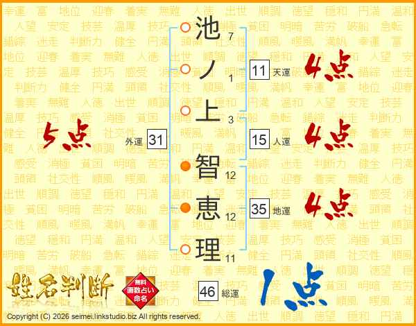池(7画)ノ(1画)上(3画) 智(12画)恵(12画)理(11画)
