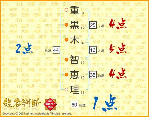 重(9画)黒(12画)木(4画) 智(12画)恵(12画)理(11画)