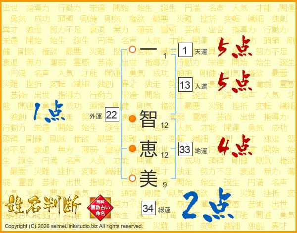 一(1画) 智(12画)恵(12画)美(9画)