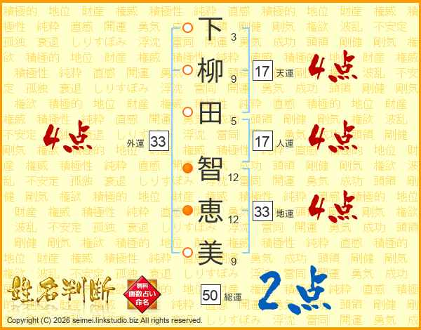 下(3画)柳(9画)田(5画) 智(12画)恵(12画)美(9画)