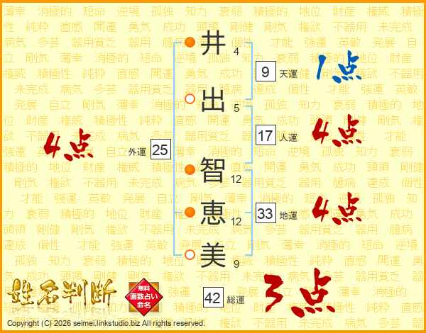 井(4画)出(5画) 智(12画)恵(12画)美(9画)