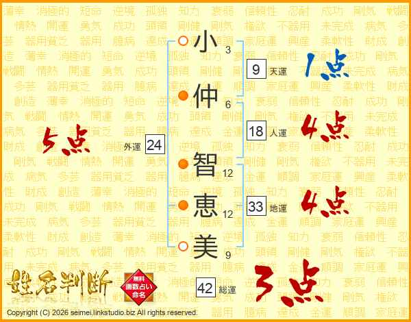 小(3画)仲(6画) 智(12画)恵(12画)美(9画)