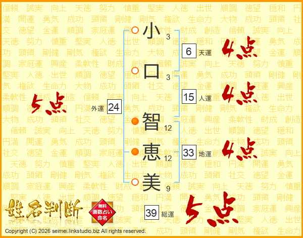小(3画)口(3画) 智(12画)恵(12画)美(9画)