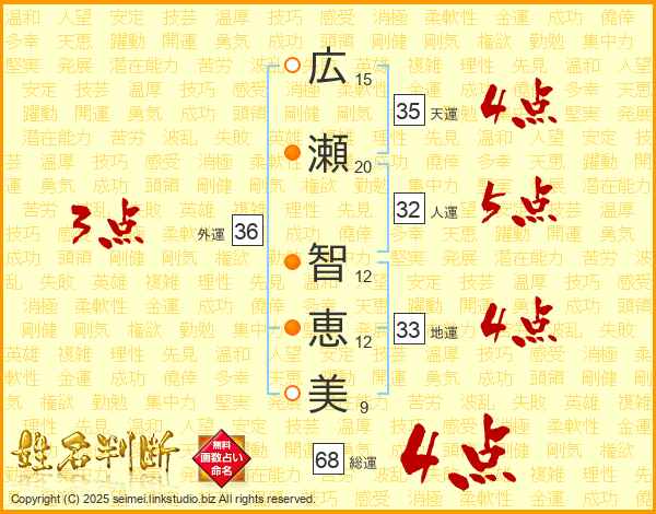 広(15画)瀬(20画) 智(12画)恵(12画)美(9画)