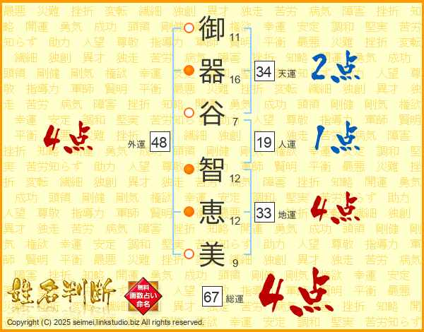御(11画)器(16画)谷(7画) 智(12画)恵(12画)美(9画)
