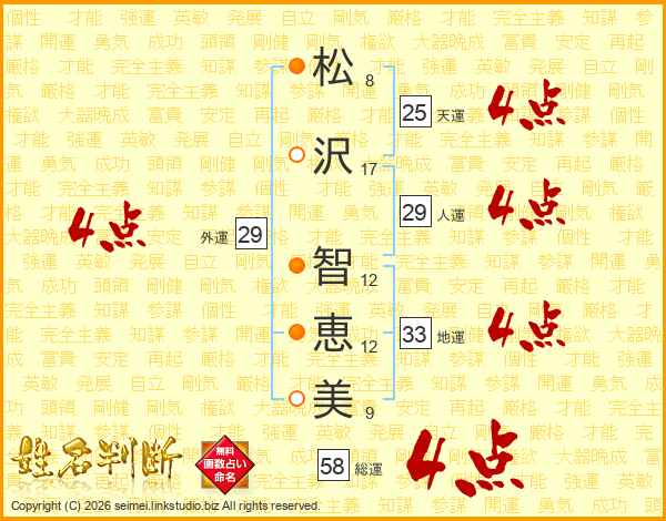 松(8画)沢(17画) 智(12画)恵(12画)美(9画)