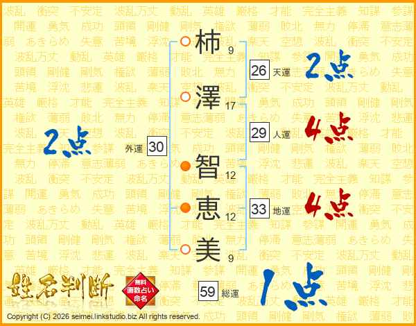 柿(9画)澤(17画) 智(12画)恵(12画)美(9画)