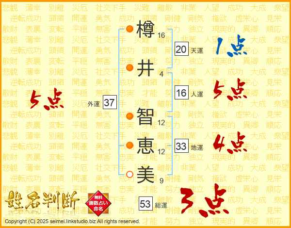 樽(16画)井(4画) 智(12画)恵(12画)美(9画)