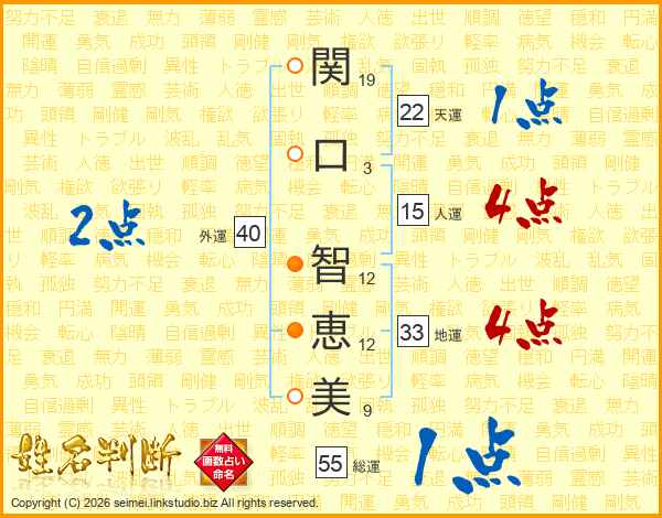 関(19画)口(3画) 智(12画)恵(12画)美(9画)