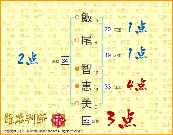 飯(13画)尾(7画) 智(12画)恵(12画)美(9画)