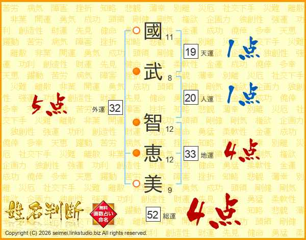 國(11画)武(8画) 智(12画)恵(12画)美(9画)