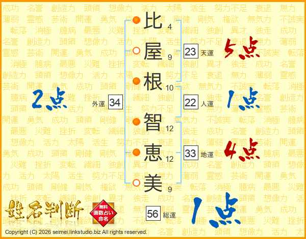 比(4画)屋(9画)根(10画) 智(12画)恵(12画)美(9画)