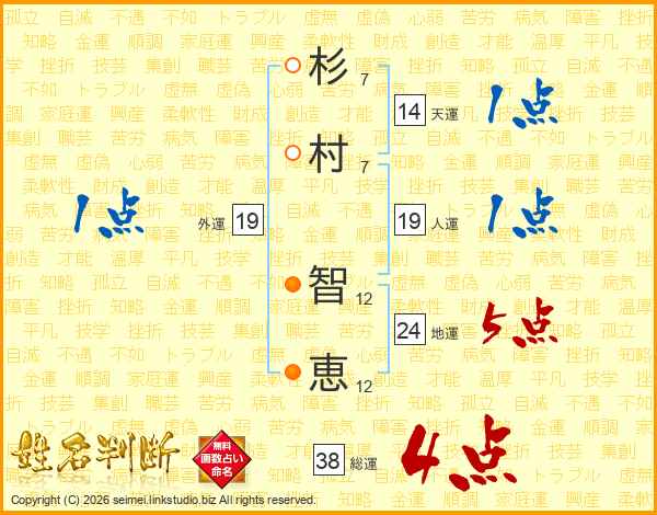 杉(7画)村(7画) 智(12画)恵(12画)