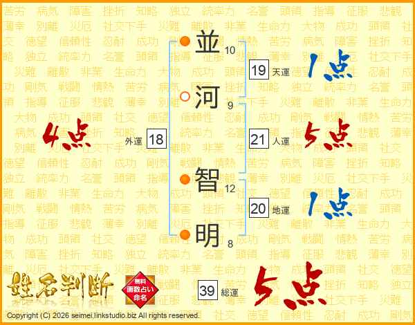 生活面を象徴する運勢です。外部から受ける影響力を表し、結婚運、家庭運や職場、環境への順応性を表します。総運から人運を引いた画数。姓や名が1文字の場合を除く。