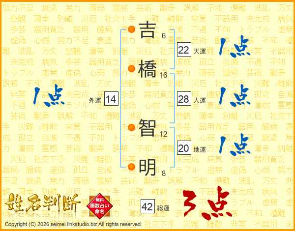 吉(6画)橋(16画) 智(12画)明(8画)
