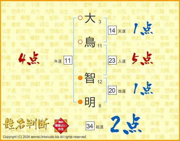 大(3画)鳥(11画) 智(12画)明(8画)