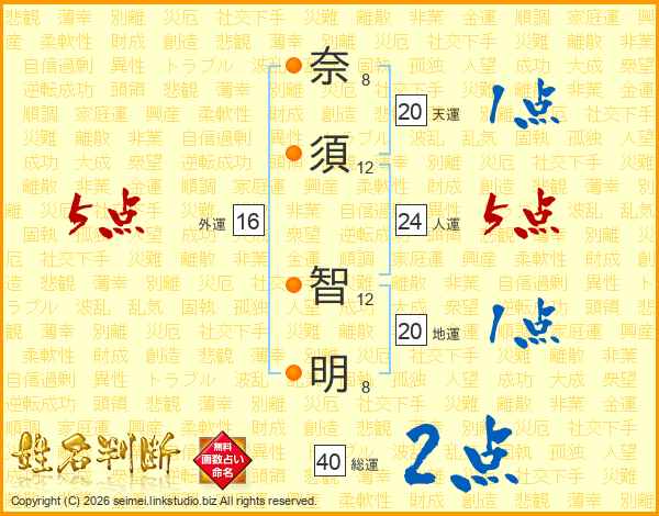 奈(8画)須(12画) 智(12画)明(8画)