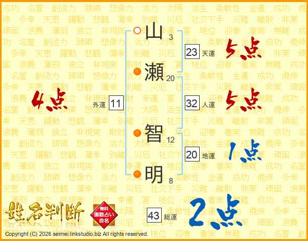 あなたの人生を表す1番重要な運勢です。生涯を通じて影響する総合運となり、主に50歳以降の晩年期に影響を及ぼします。苗字と名前の合計画数。