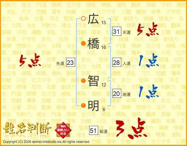 広(15画)橋(16画) 智(12画)明(8画)