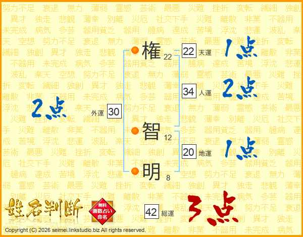権(22画) 智(12画)明(8画)