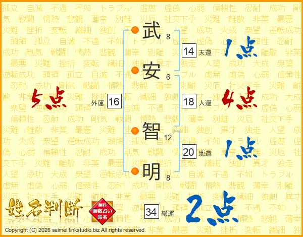 生活面を象徴する運勢です。外部から受ける影響力を表し、結婚運、家庭運や職場、環境への順応性を表します。総運から人運を引いた画数。姓や名が1文字の場合を除く。