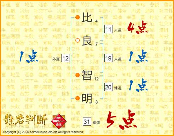 比(4画)良(7画) 智(12画)明(8画)