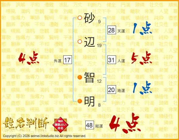砂(9画)辺(19画) 智(12画)明(8画)
