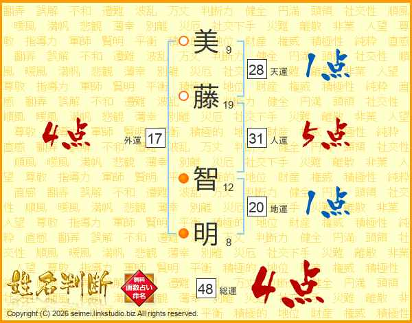 美(9画)藤(19画) 智(12画)明(8画)