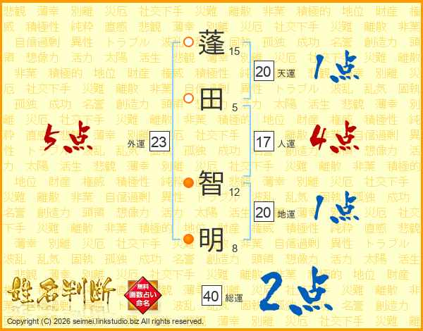 生活面を象徴する運勢です。外部から受ける影響力を表し、結婚運、家庭運や職場、環境への順応性を表します。総運から人運を引いた画数。姓や名が1文字の場合を除く。