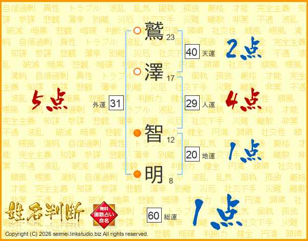 鷲(23画)澤(17画) 智(12画)明(8画)
