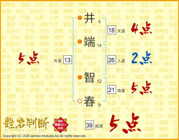 あなたの人生を表す1番重要な運勢です。生涯を通じて影響する総合運となり、主に50歳以降の晩年期に影響を及ぼします。苗字と名前の合計画数。