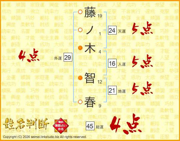 藤(19画)ノ(1画)木(4画) 智(12画)春(9画)