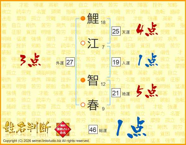 生活面を象徴する運勢です。外部から受ける影響力を表し、結婚運、家庭運や職場、環境への順応性を表します。総運から人運を引いた画数。姓や名が1文字の場合を除く。