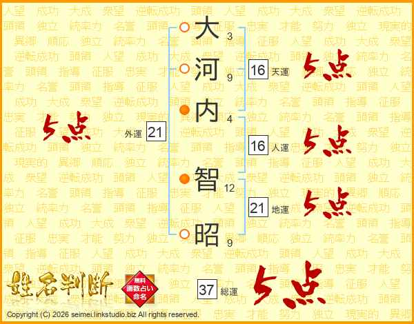 大(3画)河(9画)内(4画) 智(12画)昭(9画)