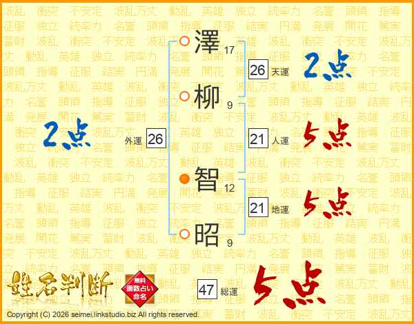 澤(17画)柳(9画) 智(12画)昭(9画)