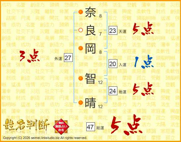奈(8画)良(7画)岡(8画) 智(12画)晴(12画)