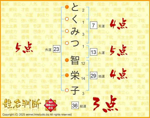 と(2画)く(1画)み(3画)つ(1画) 智(12画)栄(14画)子(3画)