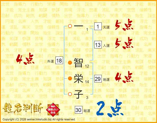 あなたの人生を表す1番重要な運勢です。生涯を通じて影響する総合運となり、主に50歳以降の晩年期に影響を及ぼします。苗字と名前の合計画数。