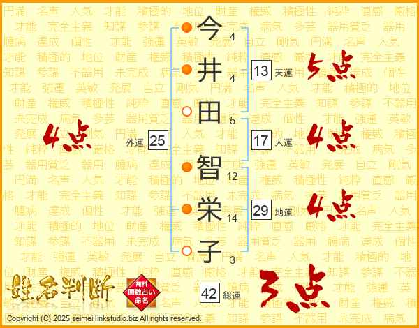 今(4画)井(4画)田(5画) 智(12画)栄(14画)子(3画)