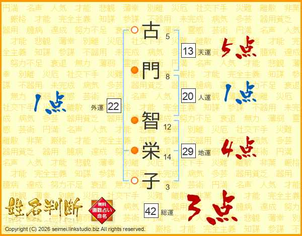 古(5画)門(8画) 智(12画)栄(14画)子(3画)